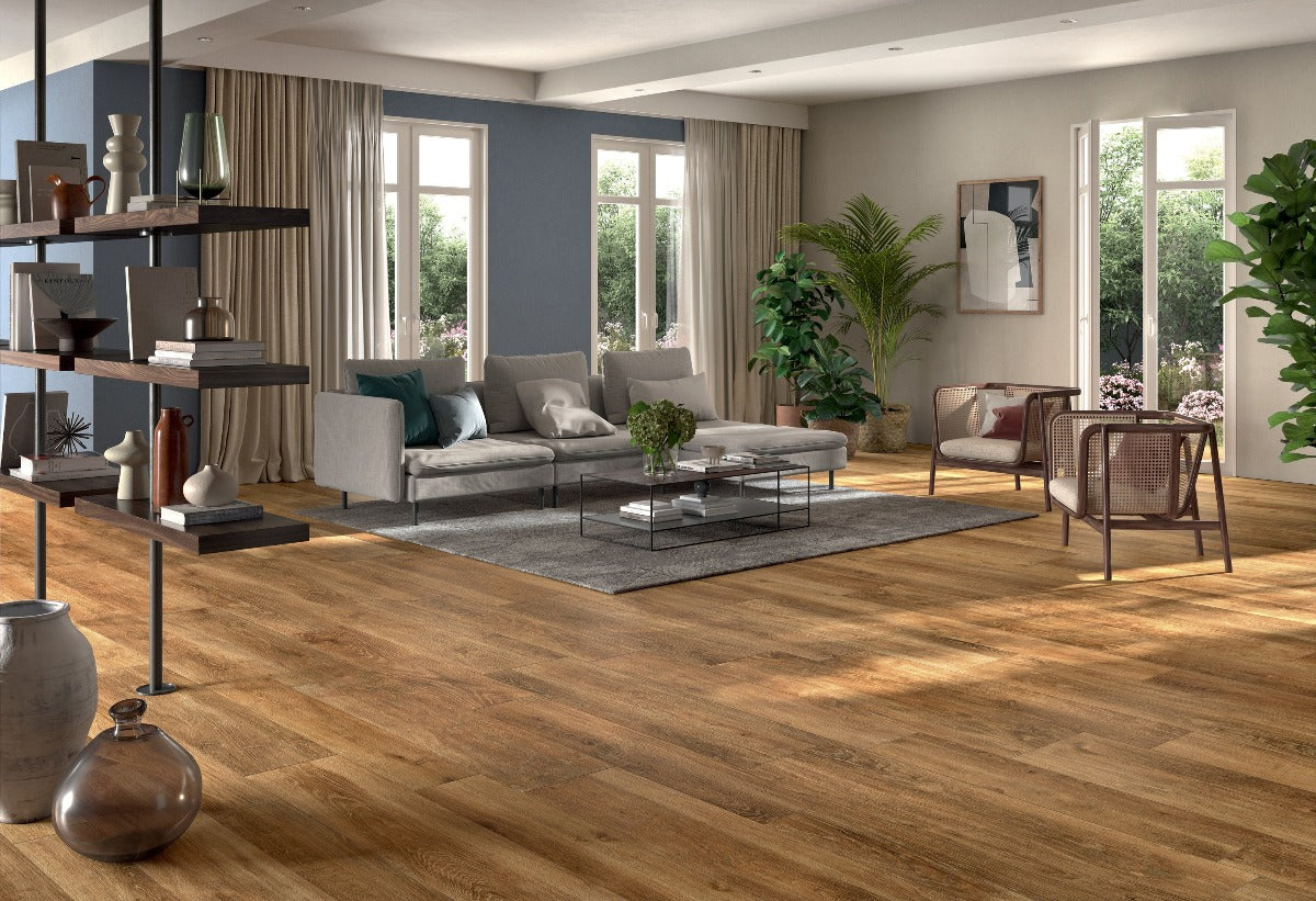 Brings a clean, down-to-earth feel, English Ancient Oak tiles feature a soft grain and driftwood tones, offering a calm look. Ideal for relaxed, modern interiors.