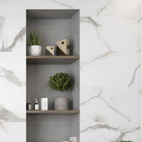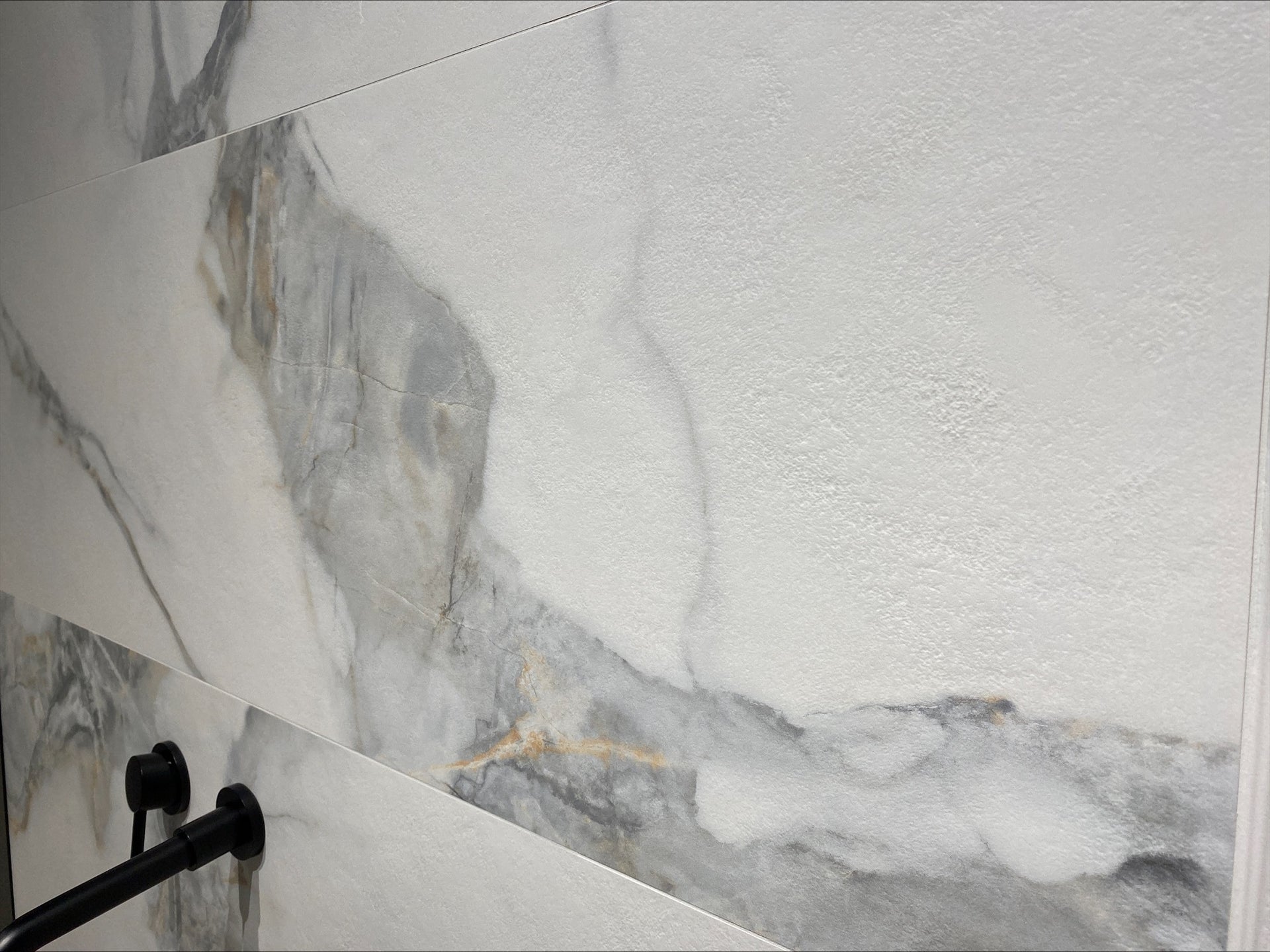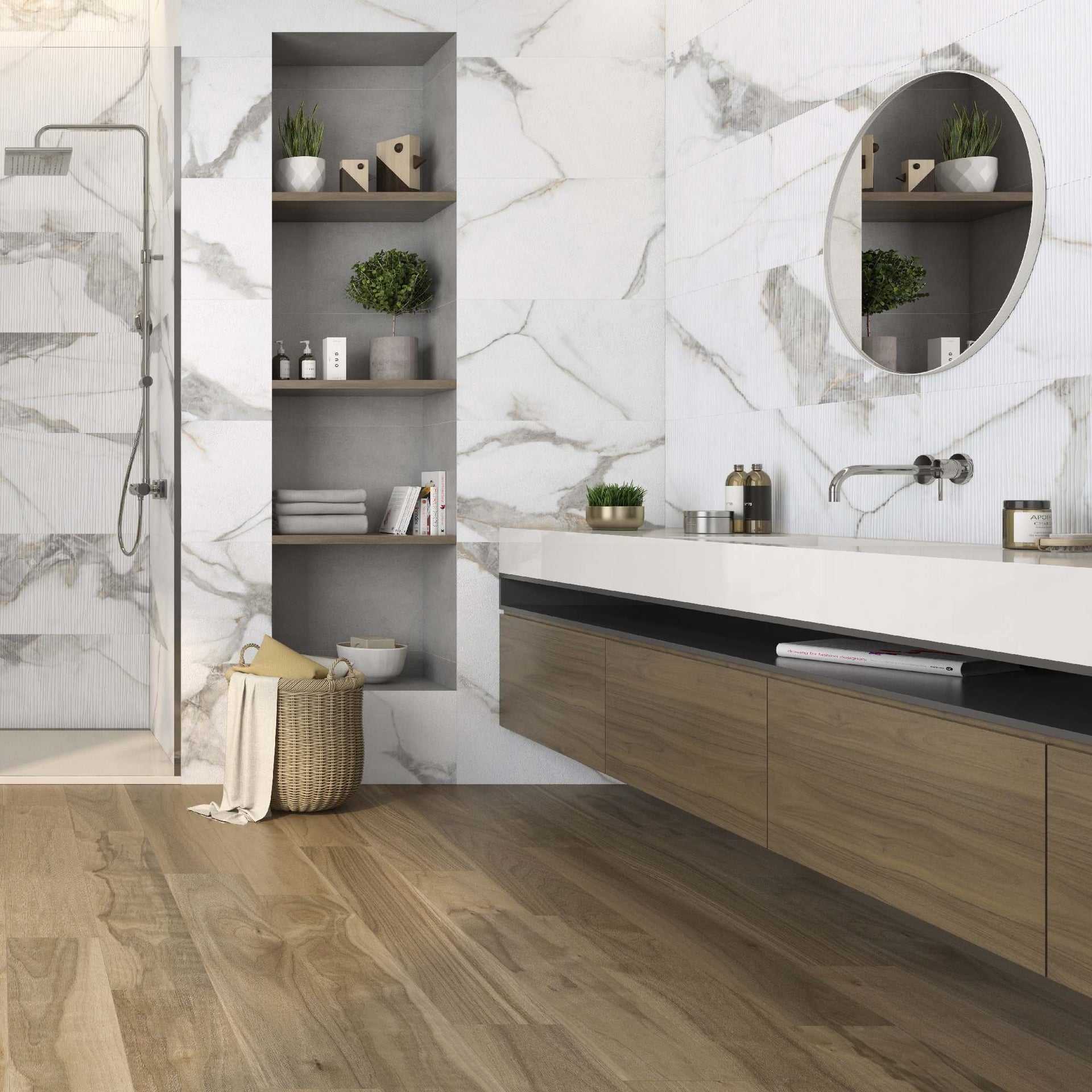 Achieve a stunning hotel-chic design with the Avenza White Marble Effect wall tile. This large format ceramic tile, featuring a matt finish, is adorned with beautiful blue-grey and copper veining.