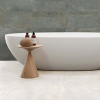 Bathroom with a white bathtub, wooden side table, and tropical plants outside.