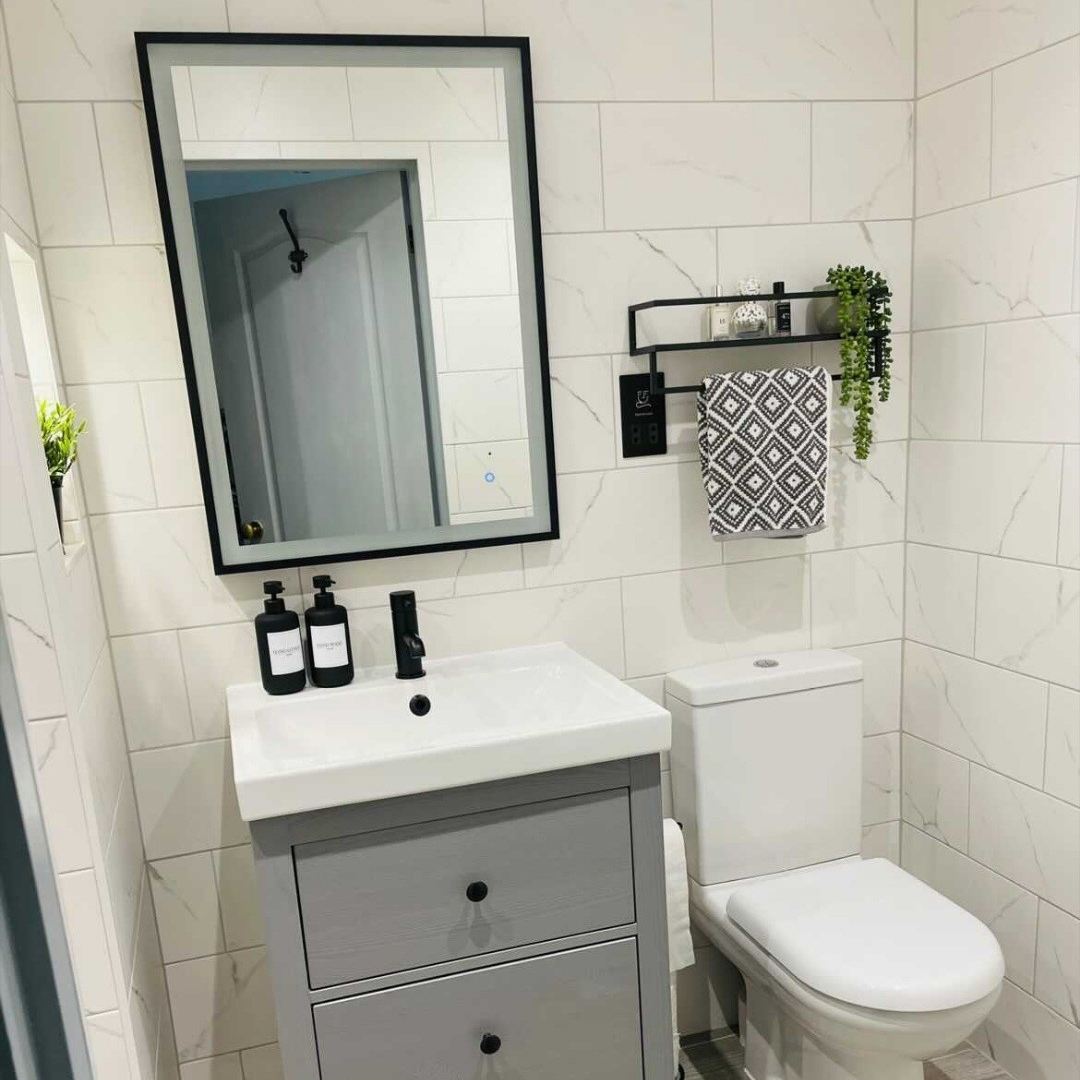A quality marble effect tile, adding a timeless chic to the walls and brightening the space with a natural matt finish, to soften and absorb the light in the room.