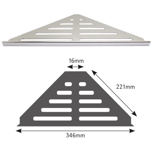 Fits in 90 degree corners. The shelf attaches in the grout joint with silicone - no drilling required!