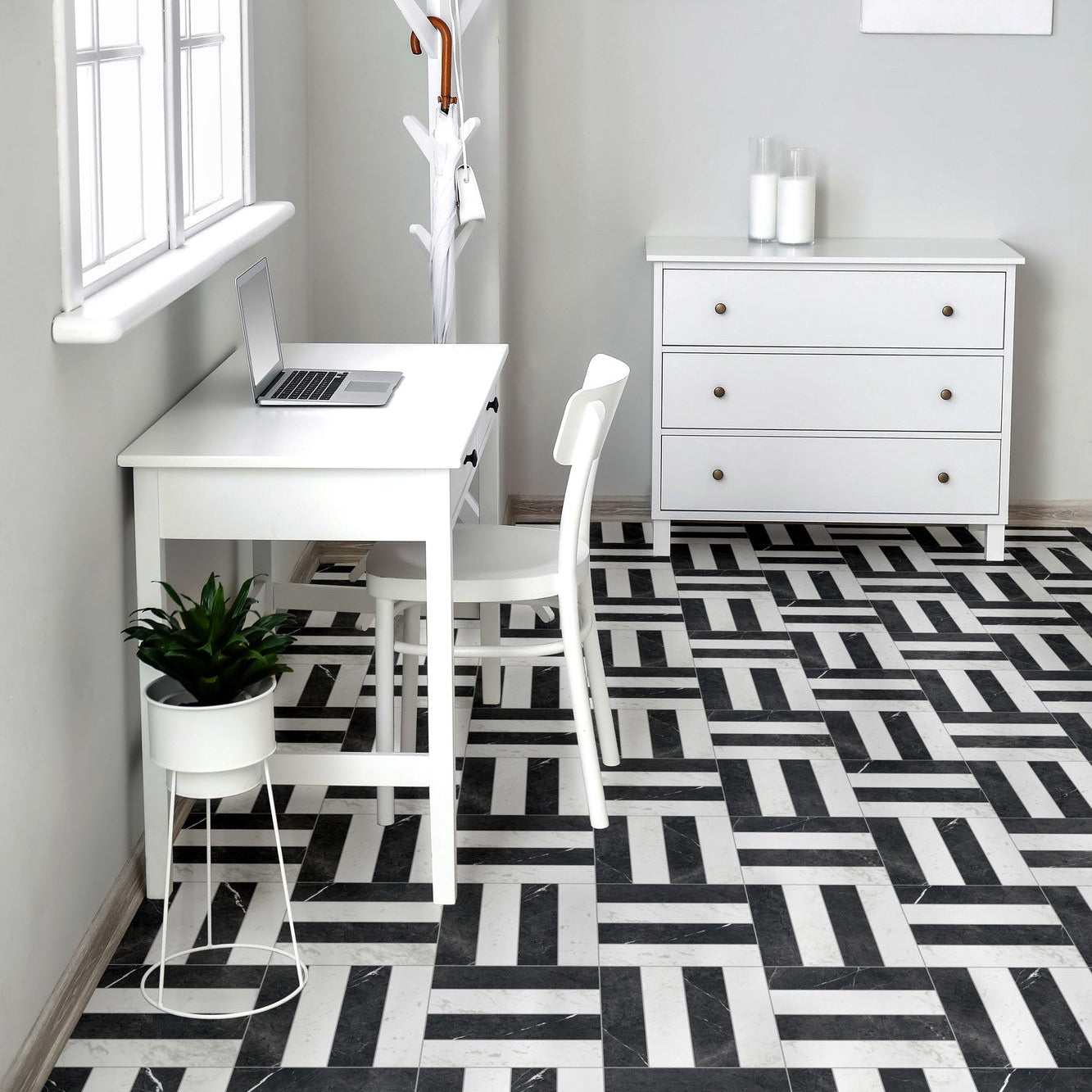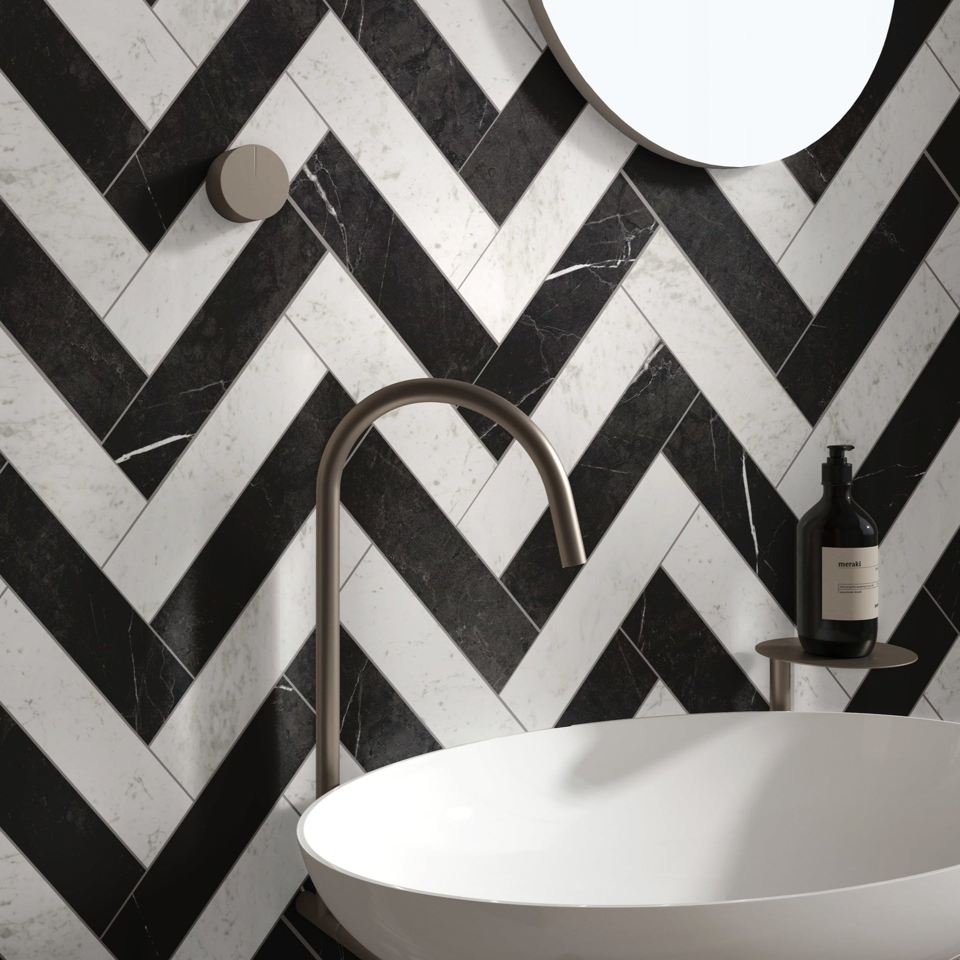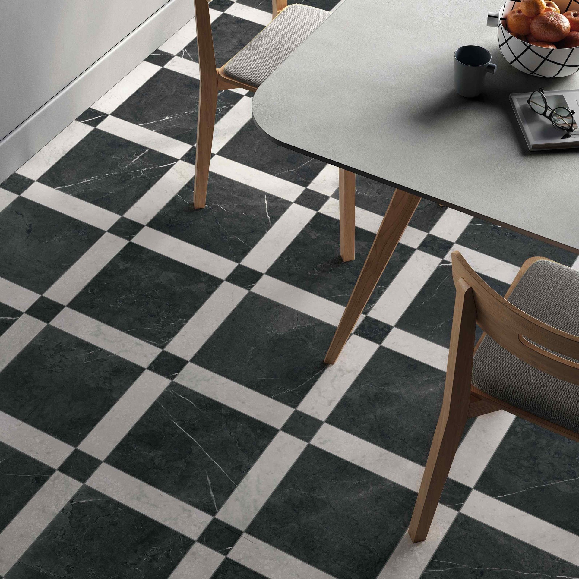 Classic white marble‑effect in elongated format, perfect for herringbone or stacked designs. Works beautifully with Noir for a clean checkerboard effect.