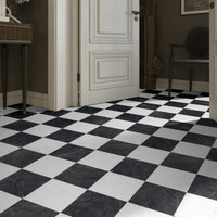 Striking black marble‑effect in large square format. Creates dramatic checkerboard floors when paired with Blanc.